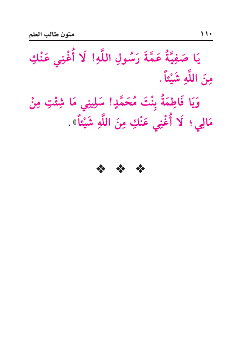 يَا صَفِيَّةُ عَمَّةَ رَسُولِ اللَّهِ! لَا أُغْنِي عَنْكِ مِنَ اللَّهِ شَيْئاً.