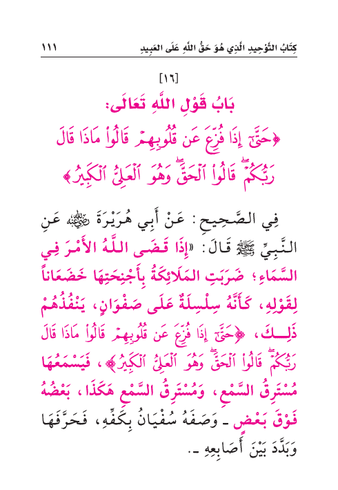 فِي الصَّحِيحِ: عَنْ أَبِي هُرَيْرَةَ رَضِيَ اللهُ عَنْهُ عَنِ النَّبِيِّ صَلَّى اللهُ عَلَيْهِ وَسَلَّمَ قَالَ: «إِذَا قَضَى اللَّهُ الأَمْرَ فِي السَّمَاءِ؛ ضَرَبَتِ المَلَائِكَةُ بِأَجْنِحَتِهَا خَضَعَاناً لِقَوْلِهِ، كَأَنَّهُ سِلْسِلَةٌ عَلَى صَفْوَانٍ، يَنْفُذُهُمْ ذَلِكَ، {حَتَّى إِذَا فُزِّعَ عَن قُلُوبِهِمْ قَالُوا مَاذَا قَالَ رَبُّكُمْ قَالُوا الْحَقَّ وَهُوَ الْعَلِيُّ الْكَبِيرُ}، فَيَسْمَعُهَا مُسْتَرِقُ السَّمْعِ، وَمُسْتَرِقُ السَّمْعِ هَكَذَا، بَعْضُهُ فَوْقَ بَعْضٍ - وَصَفَهُ سُفْيَانُ بِكَفِّهِ، فَحَرَّفَهَا وَبَدَّدَ بَيْنَ أَصَابِعِهِ -.