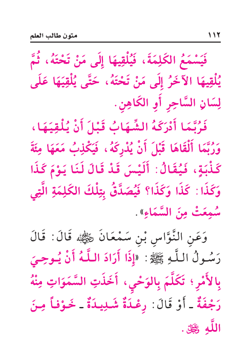 وَعَنِ النَّوَّاسِ بْنِ سَمْعَانَ رَضِيَ اللهُ عَنْهُ قَالَ: قَالَ رَسُولُ اللَّهِ صَلَّى اللهُ عَلَيْهِ وَسَلَّمَ: «إِذَا أَرَادَ اللَّهُ أَنْ يُوحِيَ بِالأَمْرِ؛ تَكَلَّمَ بِالوَحْيِ، أَخَذَتِ السَّمَوَاتِ مِنْهُ رَجْفَةٌ - أَوْ قَالَ: رِعْدَةٌ شَدِيدَةٌ - خَوْفاً مِنَ اللَّهِ عَزَّ وَجَلَّ.
