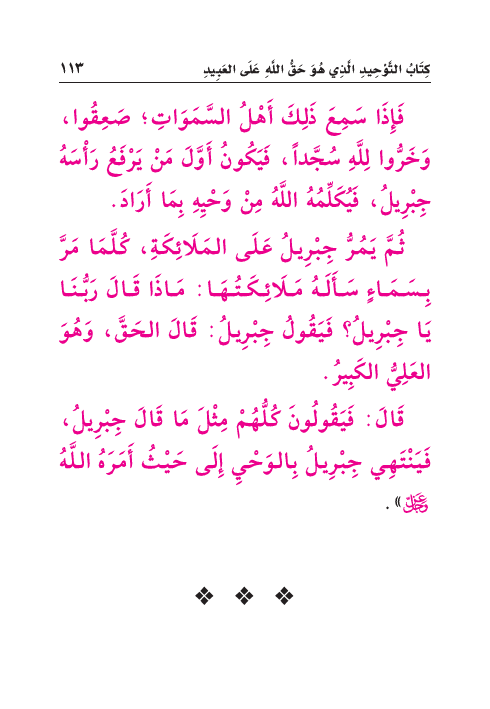 ثُمَّ يَمُرُّ جِبْرِيلُ عَلَى المَلَائِكَةِ، كُلَّمَا مَرَّ بِسَمَاءٍ سَأَلَهُ مَلَائِكَتُهَا: مَاذَا قَالَ رَبُّنَا يَا جِبْرِيلُ؟ فَيَقُولُ جِبْرِيلُ: قَالَ الحَقَّ، وَهُوَ العَلِيُّ الكَبِيرُ.