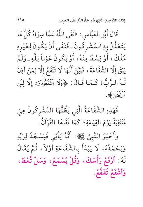 قَالَ أَبُو العَبَّاسِ: «نَفَى اللَّهُ عَمَّا سِوَاهُ كُلَّ مَا يَتَعَلَّقُ بِهِ المُشْرِكُونَ - فَنَفَى أَنْ يَكُونَ لِغَيْرِهِ مُلْكٌ، أَوْ قِسْطٌ مِنْهُ، أَوْ يَكُونَ عَوْناً لِلَّهِ - وَلَمْ يَبْقَ إِلَّا الشَّفَاعَةُ، فَبَيَّنَ أَنَّهَا لَا تَنْفَعُ إِلَّا لِمَنْ أَذِنَ لَهُ الرَّبُّ؛ كَمَا قَالَ: {وَلَا يَشْفَعُونَ إِلَّا لِمَنِ ارْتَضَى}.