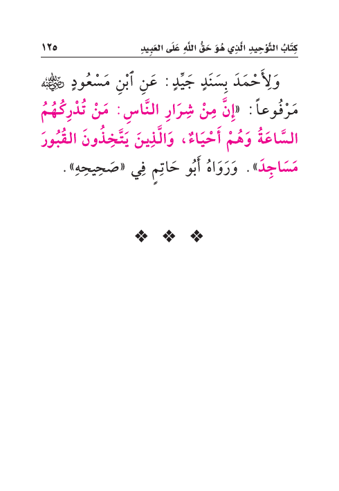 وَلِأَحْمَدَ بِسَنَدٍ جَيِّدٍ: عَنِ ابْنِ مَسْعُودٍ رَضِيَ اللهُ عَنْهُ مَرْفُوعاً: «إِنَّ مِنْ شِرَارِ النَّاسِ: مَنْ تُدْرِكُهُمُ السَّاعَةُ وَهُمْ أَحْيَاءٌ، وَالَّذِينَ يَتَّخِذُونَ القُبُورَ مَسَاجِدَ». وَرَوَاهُ أَبُو حَاتِمٍ فِي «صَحِيحِهِ».