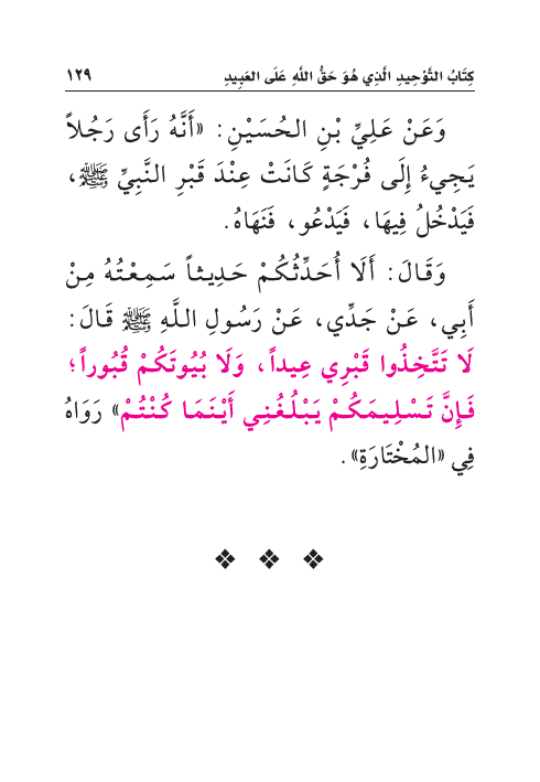 وَقَالَ: أَلَا أُحَدِّثُكُمْ حَدِيثاً سَمِعْتُهُ مِنْ أَبِي، عَنْ جَدِّي، عَنْ رَسُولِ اللَّهِ صَلَّى اللهُ عَلَيْهِ وَسَلَّمَ قَالَ: لَا تَتَّخِذُوا قَبْرِي عِيداً، وَلَا بُيُوتَكُمْ قُبُوراً؛ فَإِنَّ تَسْلِيمَكُمْ يَبْلُغُنِي أَيْنَمَا كُنْتُمْ» رَوَاهُ فِي «المُخْتَارَةِ».
