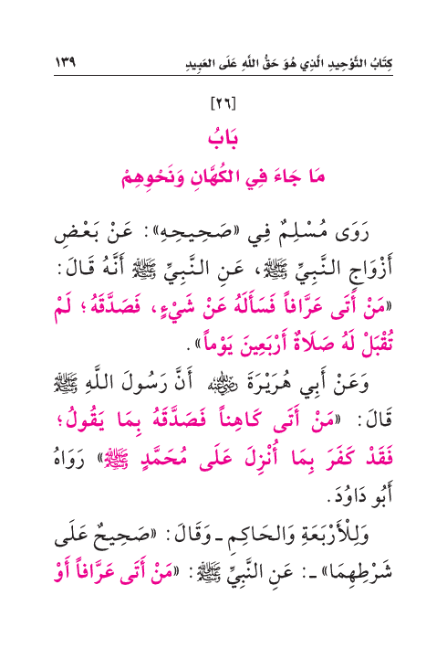 رَوَى مُسْلِمٌ فِي «صَحِيحِهِ»: عَنْ بَعْضِ أَزْوَاجِ النَّبِيِّ صَلَّى اللهُ عَلَيْهِ وَسَلَّمَ، عَنِ النَّبِيِّ صَلَّى اللهُ عَلَيْهِ وَسَلَّمَ أَنَّهُ قَالَ: «مَنْ أَتَى عَرَّافاً فَسَأَلَهُ عَنْ شَيْءٍ، فَصَدَّقَهُ؛ لَمْ تُقْبَلْ لَهُ صَلَاةٌ أَرْبَعِينَ يَوْماً».