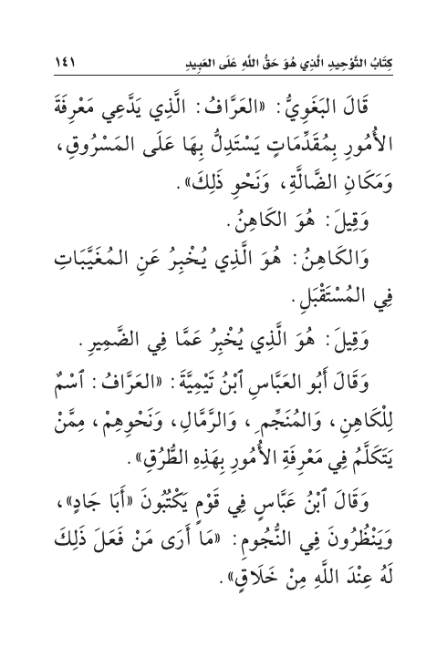 قَالَ البَغَوِيُّ: «العَرَّافُ: الَّذِي يَدَّعِي مَعْرِفَةَ الأُمُورِ بِمُقَدِّمَاتٍ يَسْتَدِلُّ بِهَا عَلَى المَسْرُوقِ، وَمَكَانِ الضَّالَّةِ، وَنَحْوِ ذَلِكَ».
