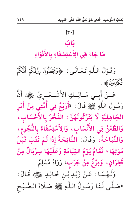 عَنْ أَبِي مَالِكٍ الأَشْعَرِيِّ رَضِيَ اللهُ عَنْهُ أَنَّ رَسُولَ اللَّهِ صَلَّى اللهُ عَلَيْهِ وَسَلَّمَ قَالَ: «أَرْبَعٌ فِي أُمَّتِي مِنْ أَمْرِ الجَاهِلِيَّةِ لَا يَتْرُكُونَهُنَّ: الفَخْرُ بِالأَحْسَابِ، وَالطَّعْنُ فِي الأَنْسَابِ، وَالِاسْتِسْقَاءُ بِالنُّجُومِ، وَالنِّيَاحَةُ، وَقَالَ: النَّائِحَةُ إِذَا لَمْ تَتُبْ قَبْلَ مَوْتِهَا؛ تُقَامُ يَوْمَ القِيَامَةِ وَعَلَيْهَا سِرْبَالٌ مِنْ قَطِرَانٍ، وَدِرْعٌ مِنْ جَرَبٍ» رَوَاهُ مُسْلِمٌ.