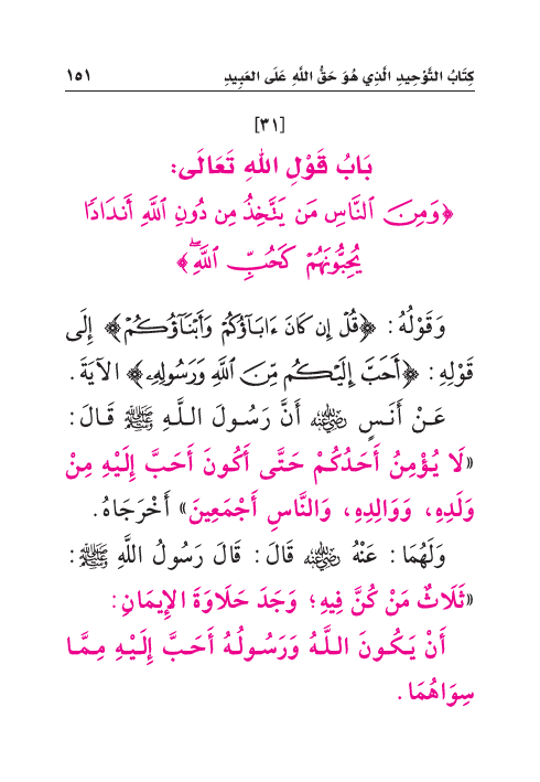 عَنْ أَنَسٍ رَضِيَ اللهُ عَنْهُ أَنَّ رَسُولَ اللَّهِ صَلَّى اللهُ عَلَيْهِ وَسَلَّمَ قَالَ: «لَا يُؤْمِنُ أَحَدُكُمْ حَتَّى أَكُونَ أَحَبَّ إِلَيْهِ مِنْ وَلَدِهِ، وَوَالِدِهِ، وَالنَّاسِ أَجْمَعِينَ» أَخْرَجَاهُ.