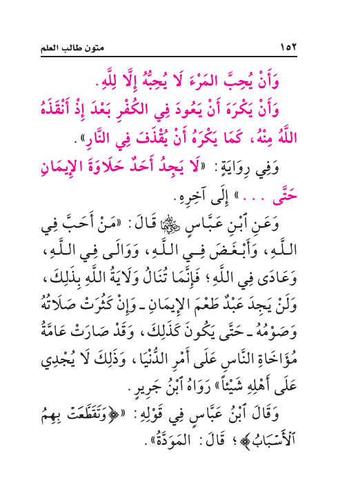وَعَنِ ابْنِ عَبَّاسٍ رَضِيَ اللهُ عَنْهُمَا قَالَ: «مَنْ أَحَبَّ فِي اللَّهِ، وَأَبْغَضَ فِي اللَّهِ، وَوَالَى فِي اللَّهِ، وَعَادَى فِي اللَّهِ؛ فَإِنَّمَا تُنَالُ وَلَايَةُ اللَّهِ بِذَلِكَ، وَلَنْ يَجِدَ عَبْدٌ طَعْمَ الإِيمَانِ - وَإِنْ كَثُرَتْ صَلَاتُهُ وَصَوْمُهُ - حَتَّى يَكُونَ كَذَلِكَ، وَقَدْ صَارَتْ عَامَّةُ مُؤَاخَاةِ النَّاسِ عَلَى أَمْرِ الدُّنْيَا، وَذَلِكَ لَا يُجْدِي عَلَى أَهْلِهِ شَيْئاً» رَوَاهُ ابْنُ جَرِيرٍ.
