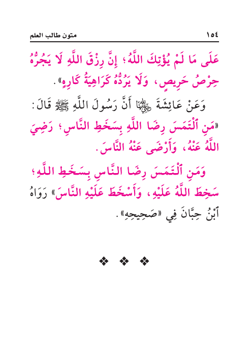 وَعَنْ عَائِشَةَ رَضِيَ اللهُ عَنْهَا أَنَّ رَسُولَ اللَّهِ صَلَّى اللهُ عَلَيْهِ وَسَلَّمَ قَالَ: «مَنِ الْتَمَسَ رِضَا اللَّهِ بِسَخَطِ النَّاسِ؛ رَضِيَ اللَّهُ عَنْهُ، وَأَرْضَى عَنْهُ النَّاسَ.