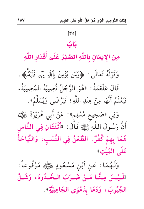وَفِي «صَحِيحِ مُسْلِمٍ»: عَنْ أَبِي هُرَيْرَةَ رَضِيَ اللهُ عَنْهُ أَنَّ رَسُولَ اللَّهِ صَلَّى اللهُ عَلَيْهِ وَسَلَّمَ قَالَ: «اثْنَتَانِ فِي النَّاسِ هُمَا بِهِمْ كُفْرٌ: الطَّعْنُ فِي النَّسَبِ، وَالنِّيَاحَةُ عَلَى المَيِّتِ».