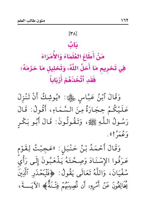 وَقَالَ ابْنُ عَبَّاسٍ رَضِيَ اللهُ عَنْهُمَا: «يُوشِكُ أَنْ تَنْزِلَ عَلَيْكُمْ حِجَارَةٌ مِنَ السَّمَاءِ، أَقُولُ: قَالَ رَسُولُ اللَّهِ صَلَّى اللهُ عَلَيْهِ وَسَلَّمَ، وَتَقُولُونَ: قَالَ أَبُو بَكْرٍ وَعُمَرُ!».