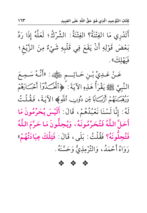 عَنْ عَدِيِّ بْنِ حَاتِمٍ رَضِيَ اللهُ عَنْهُ: «أَنَّهُ سَمِعَ النَّبِيَّ صَلَّى اللهُ عَلَيْهِ وَسَلَّمَ يَقْرَأُ هَذِهِ الآيَةَ: {اتَّخَذُوا أَحْبَارَهُمْ وَرُهْبَانَهُمْ أَرْبَابًا مِّن دُونِ اللَّهِ} الآيَةَ، فَقُلْتُ لَهُ: إِنَّا لَسْنَا نَعْبُدُهُمْ، قَالَ: أَلَيْسَ يُحَرِّمُونَ مَا أَحَلَّ اللَّهُ فَتُحَرِّمُونَهُ، وَيُحِلُّونَ مَا حَرَّمَ اللَّهُ فَتُحِلُّونَهُ؟ فَقُلْتُ: بَلَى، قَالَ: فَتِلْكَ عِبَادَتُهُمْ» رَوَاهُ أَحْمَدُ، وَالتِّرْمِذِيُّ وَحَسَّنَهُ.
