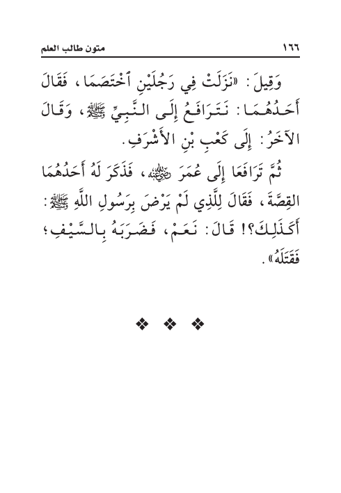 ثُمَّ تَرَافَعَا إِلَى عُمَرَ رَضِيَ اللهُ عَنْهُ، فَذَكَرَ لَهُ أَحَدُهُمَا القِصَّةَ، فَقَالَ لِلَّذِي لَمْ يَرْضَ بِرَسُولِ اللَّهِ صَلَّى اللهُ عَلَيْهِ وَسَلَّمَ: أَكَذَلِكَ؟! قَالَ: نَعَمْ، فَضَرَبَهُ بِالسَّيْفِ؛ فَقَتَلَهُ».
