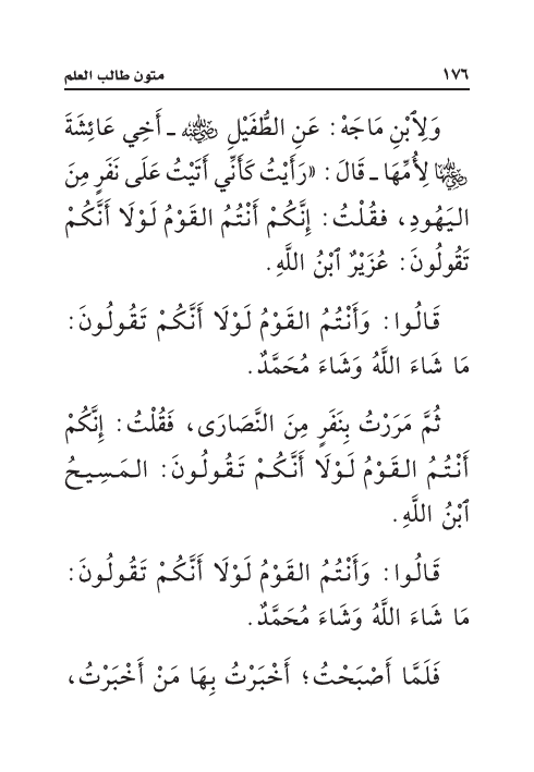 وَلِابْنِ مَاجَهْ: عَنِ الطُّفَيْلِ رَضِيَ اللهُ عَنْهُ - أَخِي عَائِشَةَ رَضِيَ اللهُ عَنْهَا لِأُمِّهَا - قَالَ: «رَأَيْتُ كَأَنِّي أَتَيْتُ عَلَى نَفَرٍ مِنَ اليَهُودِ، فقُلْتُ: إِنَّكُمْ أَنْتُمُ القَوْمُ لَوْلَا أَنَّكُمْ تَقُولُونَ: عُزَيْرٌ ابْنُ اللَّهِ.