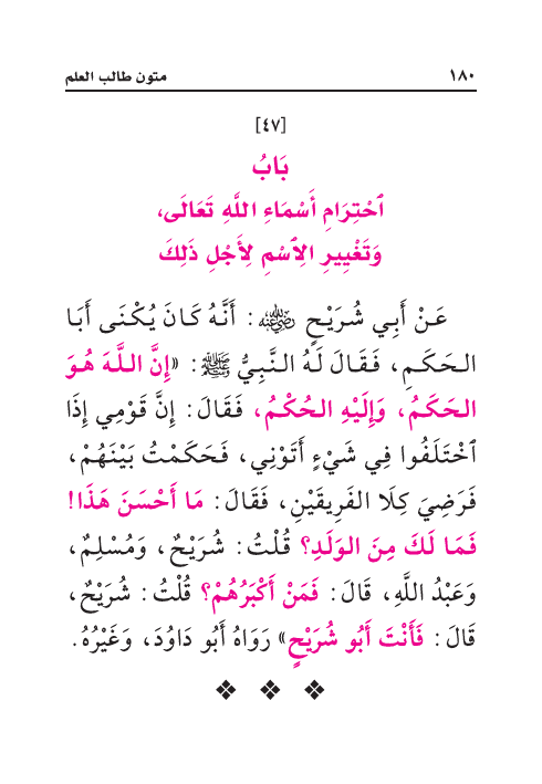 عَنْ أَبِي شُرَيْحٍ رَضِيَ اللهُ عَنْهُ: أَنَّهُ كَانَ يُكْنَى أَبَا الحَكَمِ، فَقَالَ لَهُ النَّبِيُّ صَلَّى اللهُ عَلَيْهِ وَسَلَّمَ: «إِنَّ اللَّهَ هُوَ الحَكَمُ، وَإِلَيْهِ الحُكْمُ، فَقَالَ: إِنَّ قَوْمِي إِذَا اخْتَلَفُوا فِي شَيْءٍ أَتَوْنِي، فَحَكَمْتُ بَيْنَهُمْ، فَرَضِيَ كِلَا الفَرِيقَيْنِ، فَقَالَ: مَا أَحْسَنَ هَذَا! فَمَا لَكَ مِنَ الوَلَدِ؟ قُلْتُ: شُرَيْحٌ، وَمُسْلِمٌ، وَعَبْدُ اللَّهِ، قَالَ: فَمَنْ أَكْبَرُهُمْ؟ قُلْتُ: شُرَيْحٌ، قَالَ: فَأَنْتَ أَبُو شُرَيْحٍ» رَوَاهُ أَبُو دَاوُدَ، وَغَيْرُهُ.