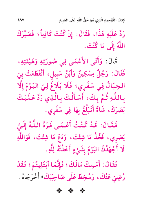 قَالَ: وَأَتَى الأَعْمَى فِي صُورَتِهِ وَهَيْئَتِهِ، فَقَالَ: رَجُلٌ مِسْكِينٌ وَابْنُ سَبِيلٍ، انْقَطَعَتْ بِيَ الحِبَالُ فِي سَفَرِي؛ فَلَا بَلَاغَ لِيَ اليَوْمَ إِلَّا بِاللَّهِ ثُمَّ بِكَ، أَسْأَلُكَ بِالَّذِي رَدَّ عَلَيْكَ بَصَرَكَ، شَاةً أَتَبَلَّغُ بِهَا فِي سَفَرِي.