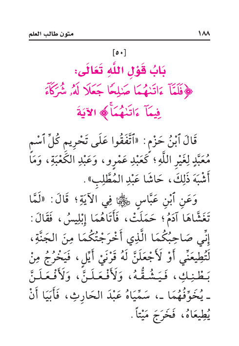 وَعَنِ ابْنِ عَبَّاسٍ رَضِيَ اللهُ عَنْهُمَا فِي الآيَةِ؛ قَالَ: «لَمَّا تَغَشَّاهَا آدَمُ؛ حَمَلَتْ، فَأَتَاهُمَا إِبْلِيسُ، فَقَالَ: إِنِّي صَاحِبُكُمَا الَّذِي أَخْرَجْتُكُمَا مِنَ الجَنَّةِ، لَتُطِيعَنِّي أَوْ لَأَجْعَلَنَّ لَهُ قَرْنَيْ أَيِّلٍ، فَيَخْرُجُ مِنْ بَطْنِكِ، فَيَشُقُّهُ، وَلَأَفْعَلَنَّ، وَلَأَفْعَلَنَّ - يُخَوِّفُهُمَا -، سَمِّيَاهُ عَبْدَ الحَارِثِ، فَأَبَيَا أَنْ يُطِيعَاهُ، فَخَرَجَ مَيْتاً.