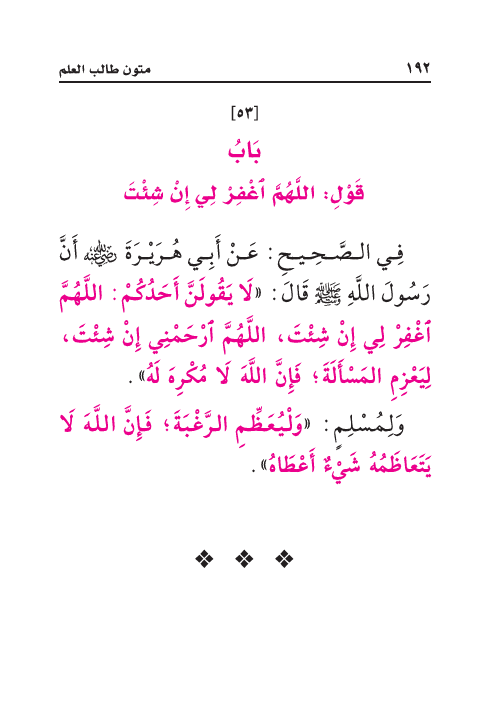 فِي الصَّحِيحِ: عَنْ أَبِي هُرَيْرَةَ رَضِيَ اللهُ عَنْهُ أَنَّ رَسُولَ اللَّهِ صَلَّى اللهُ عَلَيْهِ وَسَلَّمَ قَالَ: «لَا يَقُولَنَّ أَحَدُكُمْ: اللَّهُمَّ اغْفِرْ لِي إِنْ شِئْتَ، اللَّهُمَّ ارْحَمْنِي إِنْ شِئْتَ، لِيَعْزِمِ المَسْأَلَةَ؛ فَإِنَّ اللَّهَ لَا مُكْرِهَ لَهُ».