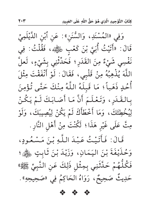 وَفِي «المُسْنَدِ، وَالسُّنَنِ»: عَنِ ابْنِ الدَّيْلَمِيِّ قَالَ: «أَتَيْتُ أُبَيَّ بْنَ كَعْبٍ رَضِيَ اللهُ عَنْهُ، فَقُلْتُ: فِي نَفْسِي شَيْءٌ مِنَ القَدَرِ؛ فَحَدِّثْنِي بِشَيْءٍ، لَعلَّ اللَّهَ يُذْهِبُهُ مِنْ قَلْبِي، فَقَالَ: لَوْ أَنْفَقْتَ مِثْلَ أُحُدٍ ذَهَباً؛ مَا قَبِلَهُ اللَّهُ مِنْكَ حَتَّى تُؤْمِنَ بِالقَدَرِ، وَتَعْلَمَ أَنَّ مَا أَصَابَكَ لَمْ يَكُنْ لِيُخْطِئَكَ، وَمَا أَخْطَأَكَ لَمْ يَكُنْ لِيُصِيبَكَ، وَلَوْ مِتَّ عَلَى غَيْرِ هَذَا؛ لَكُنْتَ مِنْ أَهْلِ النَّارِ.