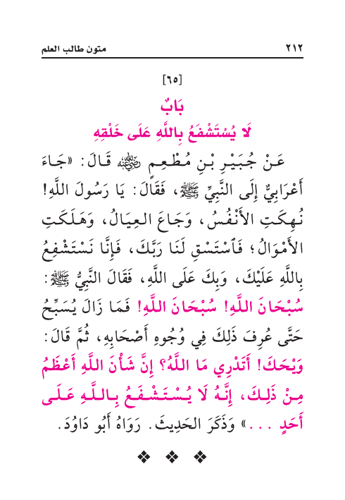 عَنْ جُبَيْرِ بْنِ مُطْعِمٍ رَضِيَ اللهُ عَنْهُ قَالَ: «جَاءَ أَعْرَابِيٌّ إِلَى النَّبِيِّ صَلَّى اللهُ عَلَيْهِ وَسَلَّمَ، فَقَالَ: يَا رَسُولَ اللَّهِ! نُهِكَتِ الأَنْفُسُ، وَجَاعَ العِيَالُ، وَهَلَكَتِ الأَمْوَالُ؛ فَاسْتَسْقِ لَنَا رَبَّكَ، فَإِنَّا نَسْتَشْفِعُ بِاللَّهِ عَلَيْكَ، وَبِكَ عَلَى اللَّهِ، فَقَالَ النَّبِيُّ صَلَّى اللهُ عَلَيْهِ وَسَلَّمَ: سُبْحَانَ اللَّهِ! سُبْحَانَ اللَّهِ! فَمَا زَالَ يُسَبِّحُ حَتَّى عُرِفَ ذَلِكَ فِي وُجُوهِ أَصْحَابِهِ، ثُمَّ قَالَ: وَيْحَكَ! أَتَدْرِي مَا اللَّهُ؟ إِنَّ شَأْنَ اللَّهِ أَعْظَمُ مِنْ ذَلِكَ، إِنَّهُ لَا يُسْتَشْفَعُ بِاللَّهِ عَلَى أَحَدٍ ... » وَذَكَرَ الحَدِيثَ. رَوَاهُ أَبُو دَاوُدَ.
