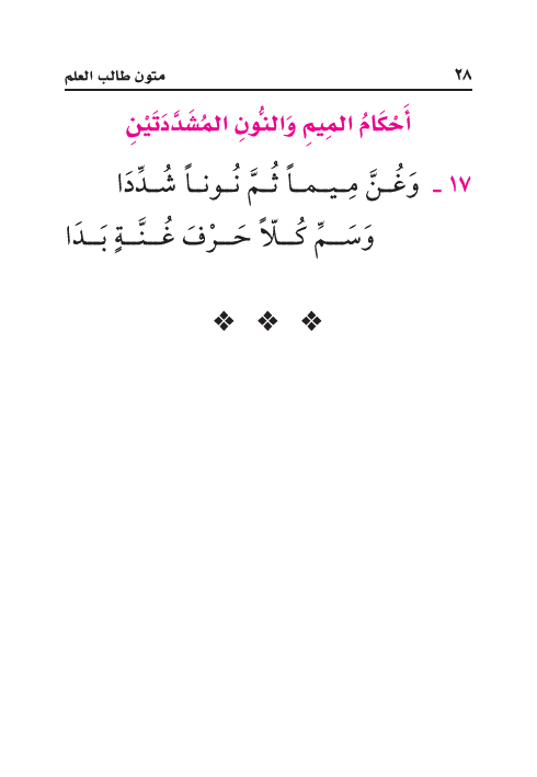 ١٧ - وَغُنَّ مِيماً ثُمَّ نُوناً شُدِّدَا ... وَسَمِّ كُلّاً حَرْفَ غُنَّةٍ بَدَا