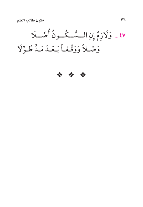 ٤٧ - وَلَازِمٌ إِنِ السُّكُونُ أُصِّلَا ... وَصْلاً وَوَقْفاً بَعْدَ مَدٍّ طُوِّلَا