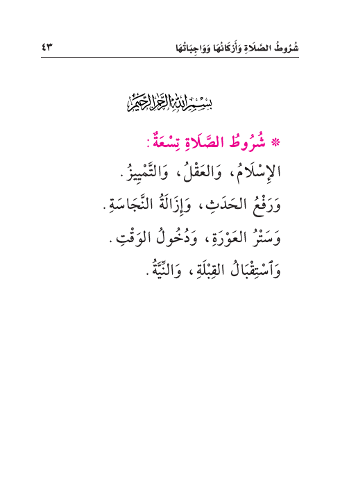 * شُرُوطُ الصَّلَاةِ تِسْعَةٌ: