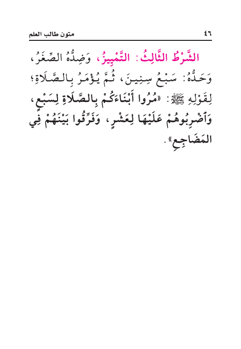 الشَّرْطُ الثَّالِثُ: التَّمْيِيزُ، وَضِدُّهُ الصِّغَرُ، وَحَدُّهُ: سَبْعُ سِنِينَ، ثُمَّ يُؤْمَرُ بِالصَّلَاةِ؛ لِقَوْلِهِ صَلَّى اللهُ عَلَيْهِ وَسَلَّمَ: «مُرُوا أَبْنَاءَكُمْ بِالصَّلَاةِ لِسَبْعٍ، وَاضْرِبُوهُمْ عَلَيْهَا لِعَشْرٍ، وَفَرِّقُوا بَيْنَهُمْ فِي المَضَاجِعِ».