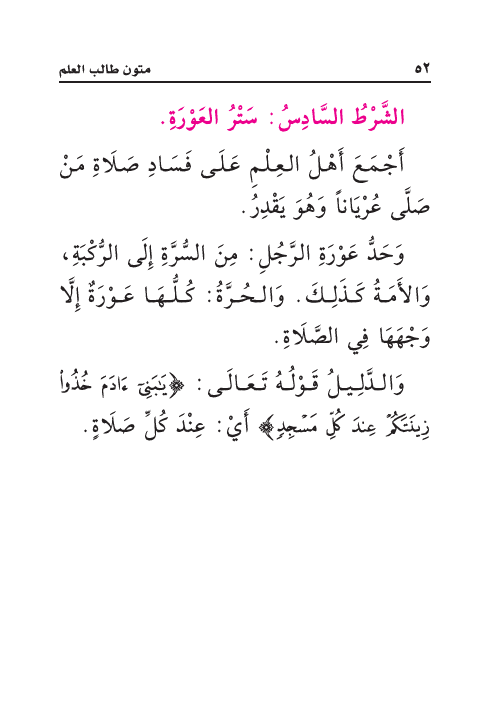الشَّرْطُ السَّادِسُ: سَتْرُ العَوْرَةِ.