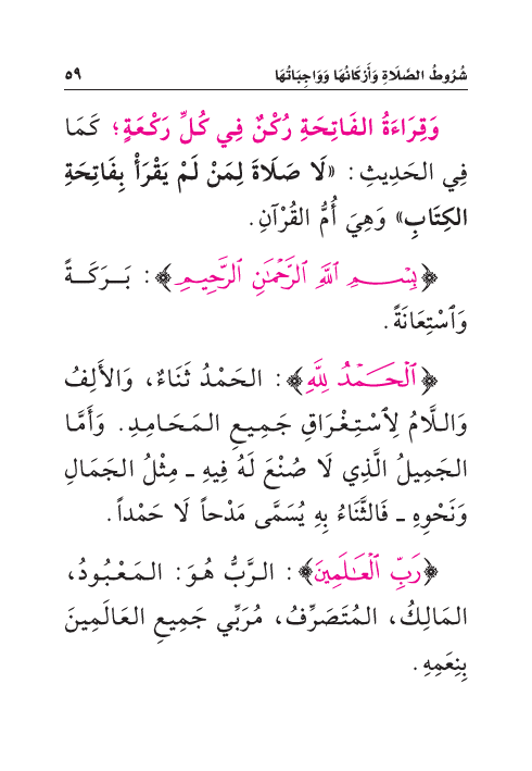 وَقِرَاءَةُ الفَاتِحَةِ رُكْنٌ فِي كُلِّ رَكْعَةٍ؛ كَمَا فِي الحَدِيثِ: «لَا صَلَاةَ لِمَنْ لَمْ يَقْرَأْ بِفَاتِحَةِ الكِتَابِ» وَهِيَ أُمُّ القُرْآنِ.