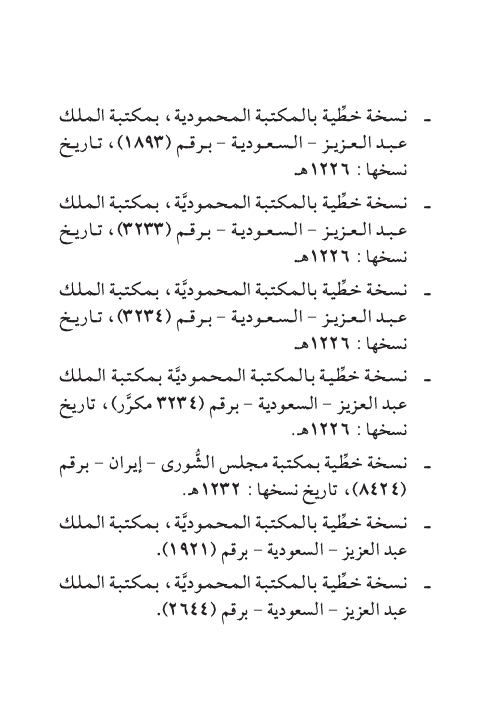 - نسخة خطِّية بالمكتبة المحمودية، بمكتبة الملك عبد العزيز - السعودية - برقم (١٨٩٣)، تاريخ نسخها: ١٢٢٦ هـ.