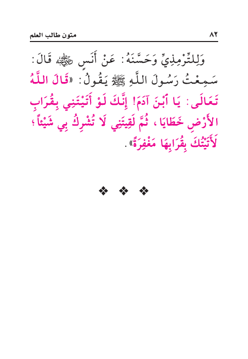 وَلِلتِّرْمِذِيِّ وَحَسَّنَهُ: عَنْ أَنَسٍ رَضِيَ اللهُ عَنْهُ قَالَ: سَمِعْتُ رَسُولَ اللَّهِ صَلَّى اللهُ عَلَيْهِ وَسَلَّمَ يَقُولُ: «قَالَ اللَّهُ تَعَالَى: يَا ابْنَ آدَمَ! إِنَّكَ لَوْ أَتَيْتَنِي بِقُرَابِ الأَرْضِ خَطَايَا، ثُمَّ لَقِيتَنِي لَا تُشْرِكُ بِي شَيْئاً؛ لَأَتَيْتُكَ بِقُرَابِهَا مَغْفِرَةً».