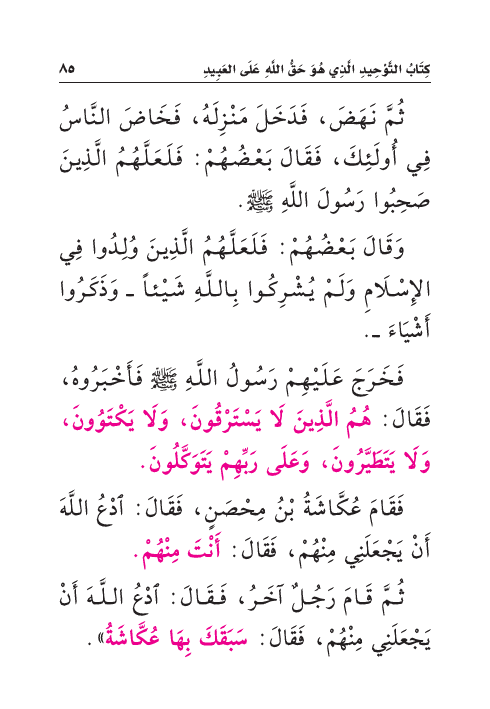 فَخَرَجَ عَلَيْهِمْ رَسُولُ اللَّهِ صَلَّى اللهُ عَلَيْهِ وَسَلَّمَ فَأَخْبَرُوهُ، فَقَالَ: هُمُ الَّذِينَ لَا يَسْتَرْقُونَ، وَلَا يَكْتَوُونَ، وَلَا يَتَطَيَّرُونَ، وَعَلَى رَبِّهِمْ يَتَوَكَّلُونَ.