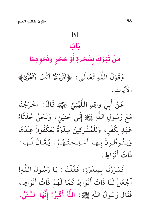 عَنْ أَبِي وَاقِدٍ اللَّيْثِيِّ رَضِيَ اللهُ عَنْهُ قَالَ: «خَرَجْنَا مَعَ رَسُولِ اللَّهِ صَلَّى اللهُ عَلَيْهِ وَسَلَّمَ إِلَى حُنَيْنٍ، وَنَحْنُ حُدَثَاءُ عَهْدٍ بِكُفْرٍ، وَلِلْمُشْرِكِينَ سِدْرَةٌ يَعْكُفُونَ عِنْدَهَا وَيَنُوطُونَ بِهَا أَسْلِحَتَهُمْ، يُقَالُ لَهَا: ذَاتُ أَنْوَاطٍ.