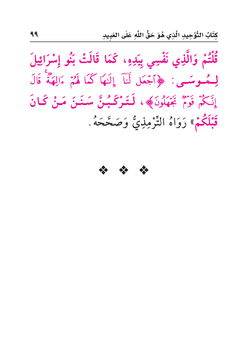 قُلْتُمْ وَالَّذِي نَفْسِي بِيَدِهِ، كَمَا قَالَتْ بَنُو إِسْرَائِيلَ لِمُوسَى: {اجْعَل لَّنَا إِلَهًا كَمَا لَهُمْ آلِهَةٌ قَالَ إِنَّكُمْ قَوْمٌ تَجْهَلُونَ}، لَتَرْكَبُنَّ سَنَنَ مَنْ كَانَ قَبْلَكُمْ» رَوَاهُ التِّرْمِذِيُّ وَصَحَّحَهُ.