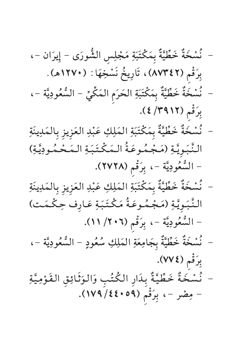 ـ نسخة خطِّية بمكتبة الملك عبد العزيز بالمدينة النبوية (مجموعة مكتبة عارف حكمت) -السعودية- برقم (٢٠٦/ ١١).