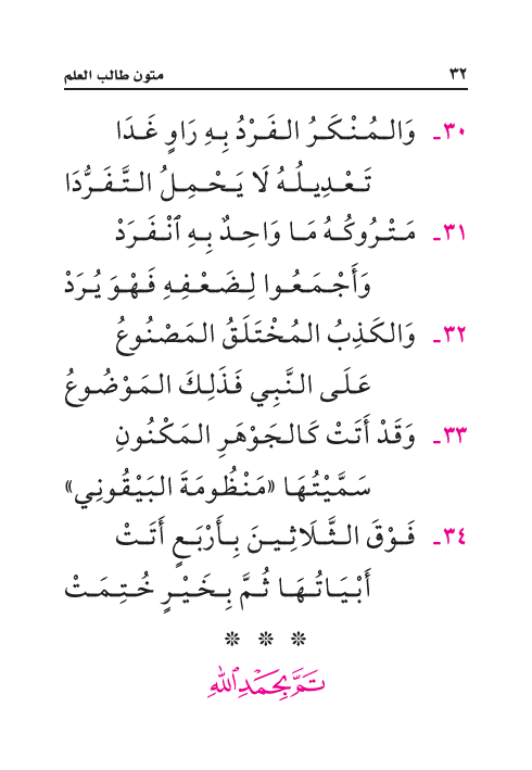 ٣٣ - وَقَدْ أَتَتْ كَالجَوْهَرِ المَكْنُونِ ... سَمَّيْتُهَا «مَنْظُومَةَ البَيْقُونِي»