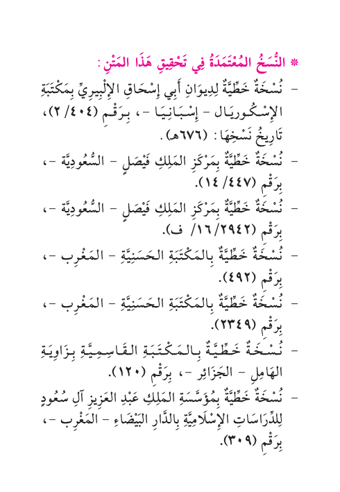 ـ نسخة خطية بمؤسسة الملك عبد العزيز آل سعود للدراسات الإسلامية بالدار البيضاء - المغرب - برقم (٣٠٩).