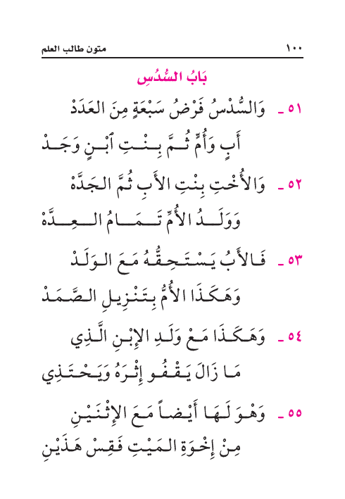 ٥١ ـ وَالسُّدْسُ فَرْضُ سَبْعَةٍ مِنَ العَدَدْ ... أَبٍ وَأُمٍّ ثُمَّ بِنْتِ ابْنٍ وَجَدْ
