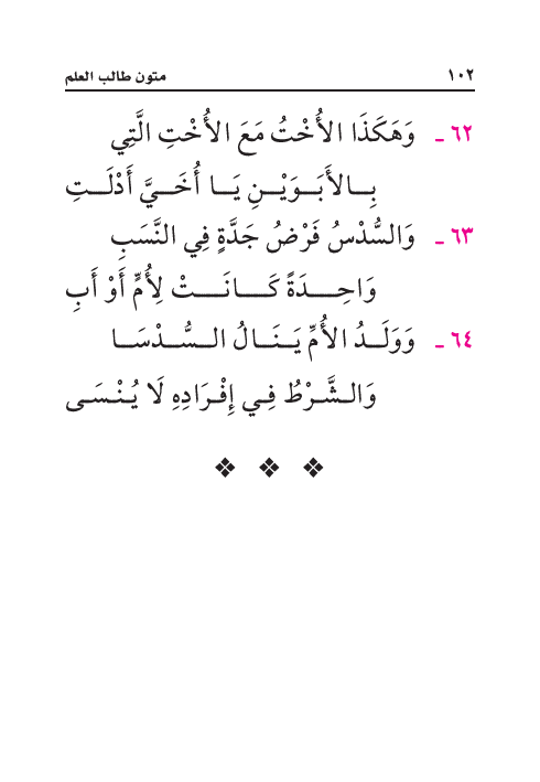 ٦٤ ـ وَوَلَدُ الأُمِّ يَنَالُ السُّدْسَا ... وَالشَّرْطُ فِي إِفْرَادِهِ لَا يُنْسَى