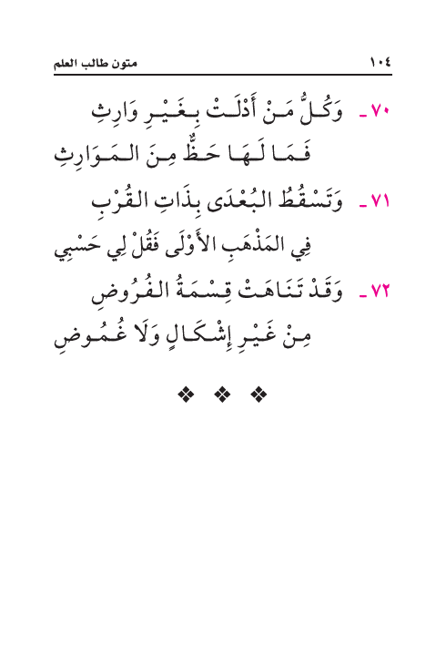 ٧٢ ـ وَقَدْ تَنَاهَتْ قِسْمَةُ الفُرُوضِ ... مِنْ غَيْرِ إِشْكَالٍ وَلَا غُمُوضِ