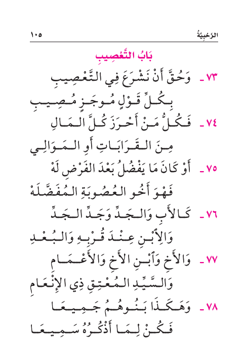 ٧٣ ـ وَحُقَّ أَنْ نَشْرَعَ فِي التَّعْصِيبِ ... بِكُلِّ قَوْلٍ مُوجَزٍ مُصِيبِ
