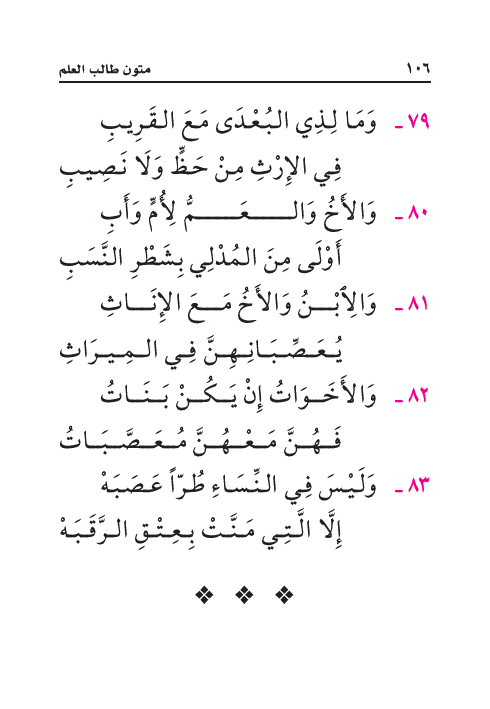٧٩ ـ وَمَا لِذِي البُعْدَى مَعَ القَرِيبِ ... فِي الإِرْثِ مِنْ حَظٍّ وَلَا نَصِيبِ