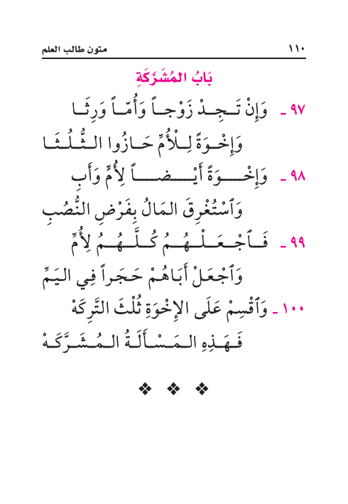 ١٠٠ ـ وَاقْسِمْ عَلَى الإِخْوَةِ ثُلْثَ التَّرِكَهْ ... فَهَذِهِ المَسْأَلَةُ المُشَرَّكَهْ