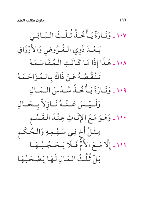 ١١١ ـ إِلَّا مَعَ الأُمِّ فَلَا يَحْجُبُهَا ... بَلْ ثُلُثُ المَالِ لَهَا يَصْحَبُهَا