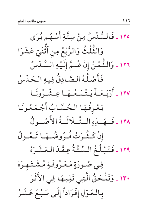 ١٢٥ ـ فَالسُّدْسُ مِنْ سِتَّةِ أَسْهُمٍ يُرَى ... وَالثُّلْثُ وَالرُّبْعُ مِنِ اثْنَيْ عَشَرَا