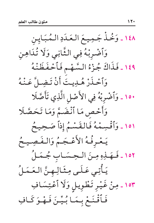 ١٤٨ ـ وَخُذْ جَمِيعَ العَدَدِ المُبَايِنِ ... وَاضْرِبْهُ فِي الثَّانِي وَلَا تُدَاهِنِ
