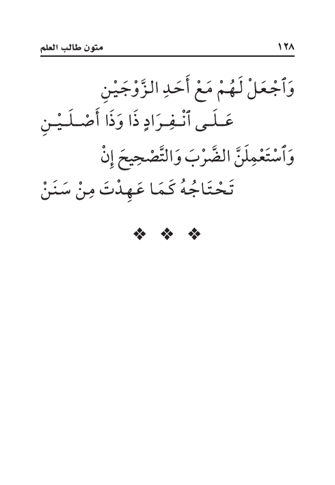 وَاسْتَعْمِلَنَّ الضَّرْبَ وَالتَّصْحِيحَ إِنْ ... تَحْتَاجُهُ كَمَا عَهِدْتَ مِنْ سَنَنْ