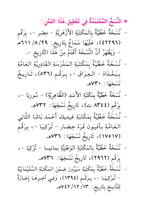 - نسخةٌ خطِّيةٌ بالمكتبة الوطنيَّة بمانيسا - تركيا -، برقم (٢٩٦٢)، تاريخُ نسخِها: ٧٣٦ هـ.