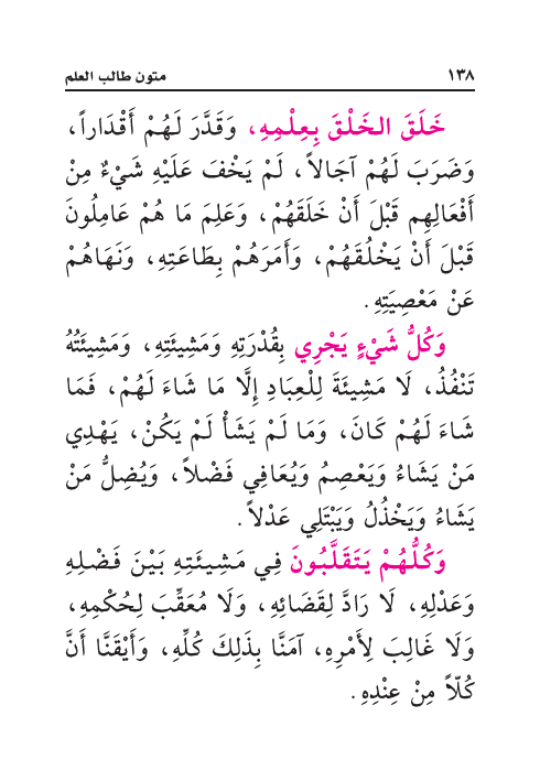 وَكُلُّ شَيْءٍ يَجْرِي بِقُدْرَتِهِ وَمَشِيئَتِهِ، وَمَشِيئَتُهُ تَنْفُذُ، لَا مَشِيئَةَ لِلْعِبَادِ إِلَّا مَا شَاءَ لَهُمْ، فَمَا شَاءَ لَهُمْ كَانَ، وَمَا لَمْ يَشَأْ لَمْ يَكُنْ، يَهْدِي مَنْ يَشَاءُ وَيَعْصِمُ وَيُعَافِي فَضْلاً، وَيُضِلُّ مَنْ يَشَاءُ وَيَخْذُلُ وَيَبْتَلِي عَدْلاً.